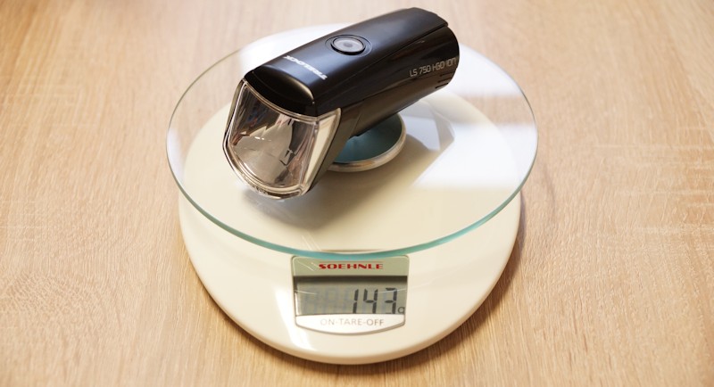 Hält man die Fahrradlampe in der Hand, hat man ein wertiges Gefühl. Die Größe und das Gewicht passen gut zusammen und die Verarbeitung der einzelnen Teile sieht sehr hochwertig aus. Es befinden sich keine scharfen Kanten oder Ecken an der Lampe. Der Fahrradscheinwerfer selbst ist schwarz und hat lediglich bei der Scheinwerferscheibe und beim Spiegel eine andere Farbe. Oben auf der Lampe befindet sich der Knopf mit der man die Trelock LS 750 ION Steuert. Dieser Knopf hat einen Durchmesser von ca. 12 mm und kann auch mit großen Fingern gut bedient werden. Das Gewicht vom Frontscheinwerfer wurde von uns mit 143 Gramm ermittelt.