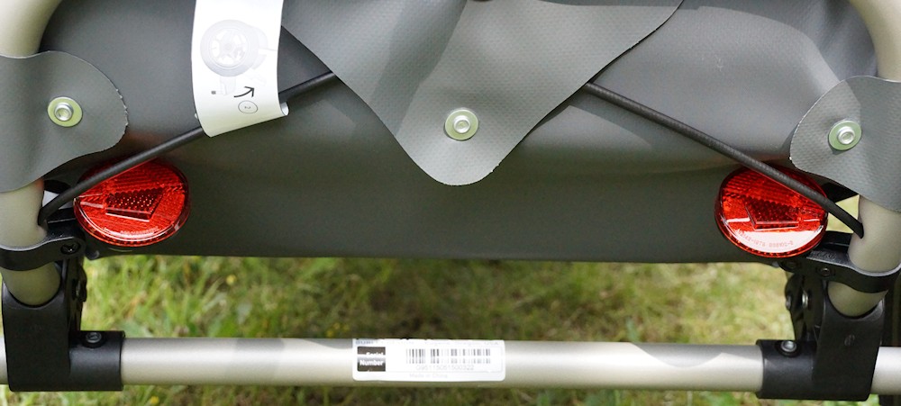 Damit andere Verkehrsteilnehmer den Anhänger auch bei Dunkelheit besser sehen sind unter dem Lastenanhänger zwei Reflektoren angebracht. Für unseren Geschmack etwas versteckt. Hier dürfte ruhig mehr in Reflexstreifen investiert werden. Der Anhänger fährt sich recht leicht hinter dem Rad, man sollte jedoch nie seine Breite vergessen. Es ist sicher nicht schlecht, wenn man noch eine zusätzliche Fahrradbeleuchtung am Anhänger montiert.