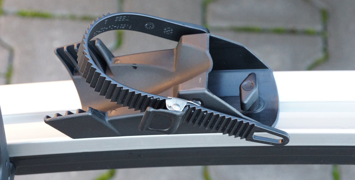 Zuerst stellen wir die Keile auf einen kleinen Abstand, heben jetzt unser Fahrrad auf den Bullwing SR7 Fahrradträger und fixieren es mit dem kurzen Greifarm. Ist dies erledigt, schieben wir die Keile bis zum Fahrradreifen und ziehen den Riemen durch die Felge um diesen dann zu fixieren. Eine Ratsche bietet der Bullwing SR7 nicht.