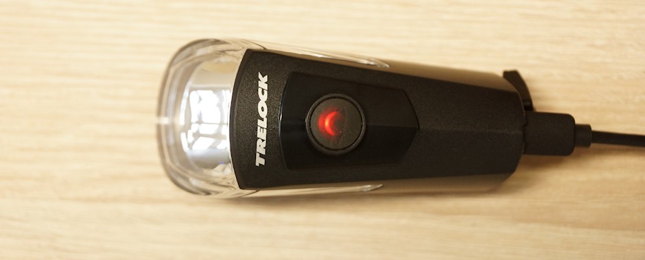 Auf der Lampe befindet sich ein Schalter mit einem Leuchtring. Mit diesem Schalter bedient man die Lampe. Leuchtet der im Schalter und unter der Gummiabdeckung verborgene Leuchtring rot, muss der Fahrradscheinwerfer geladen werden. Während des Ladevorgangs leuchtet der Ring ebenfalls rot. Über den Schalter haben wir die Möglichkeit des reinen an/Aus Prinzips. Die Fahrradlampe strahlt nur in einer fest definierten Helligkeit.